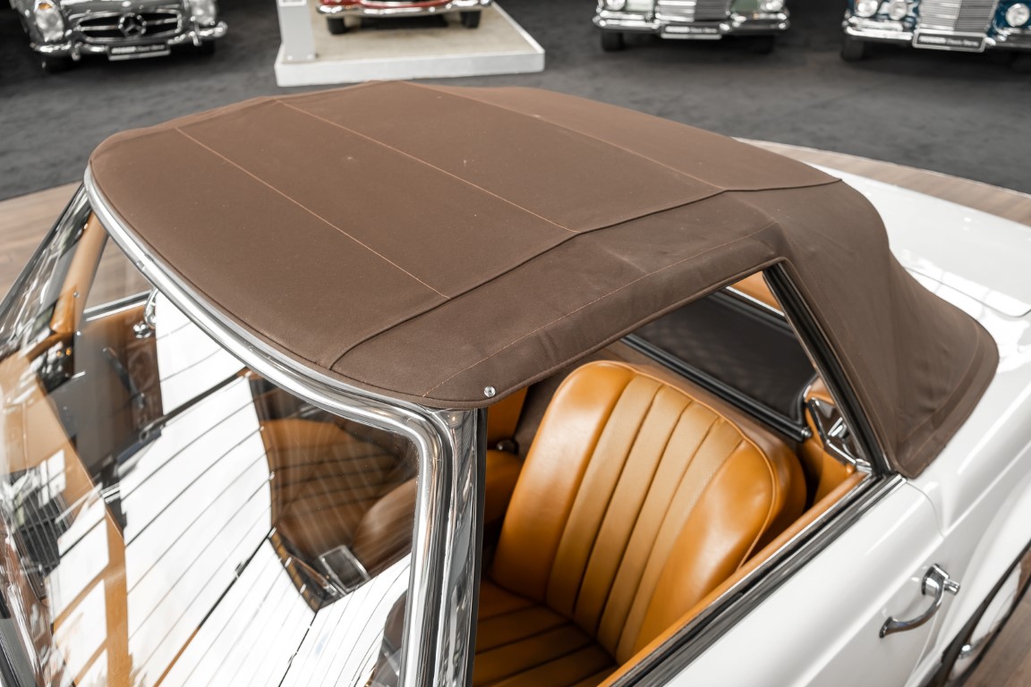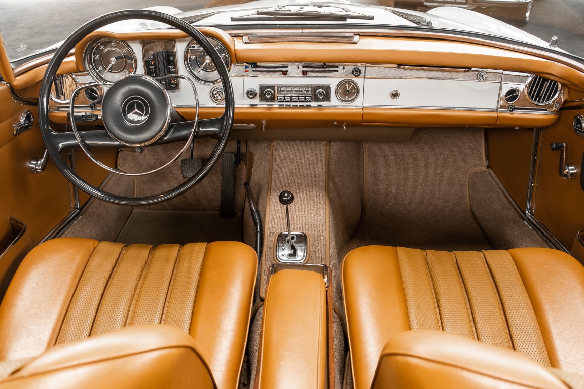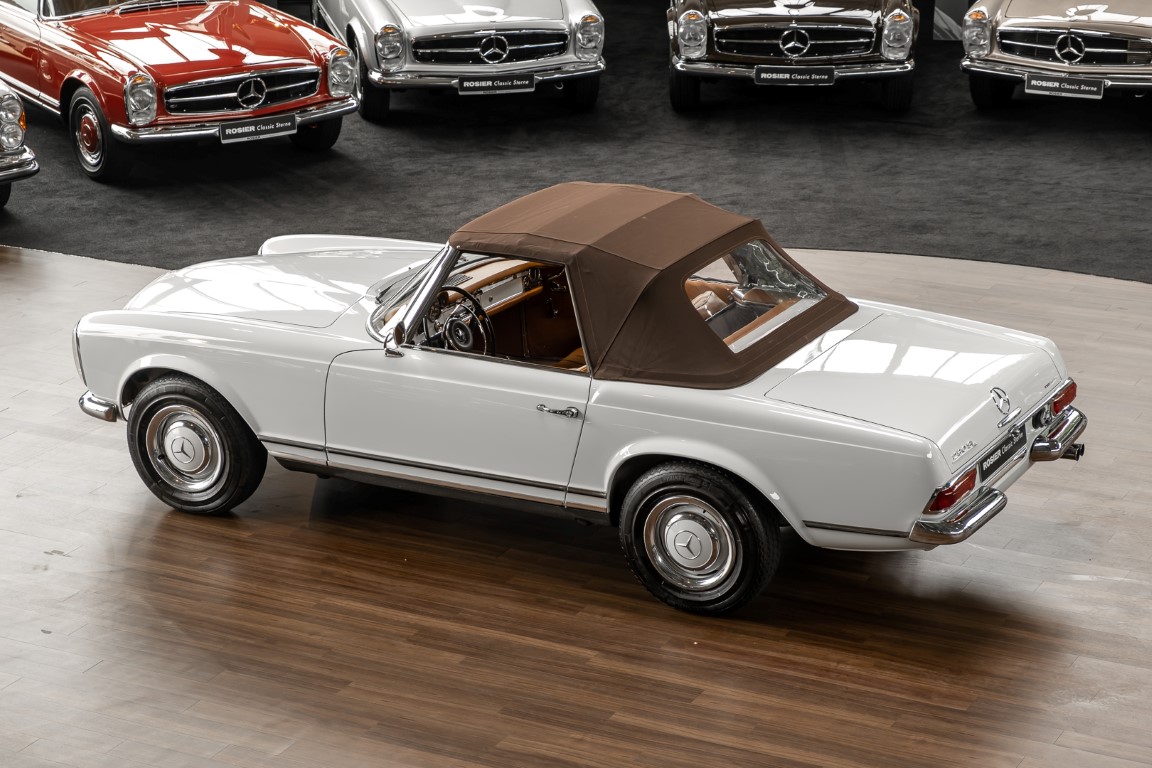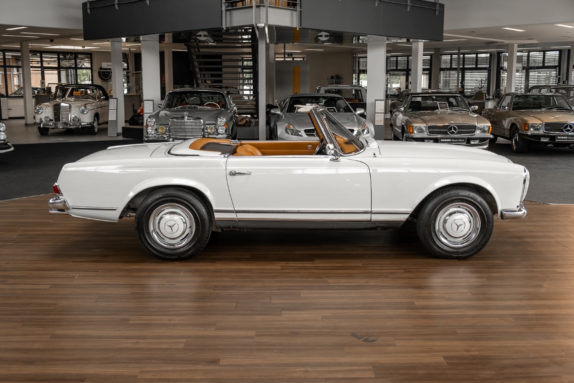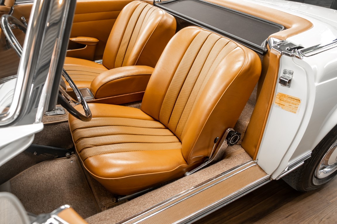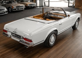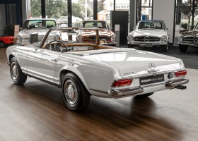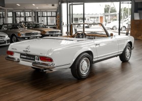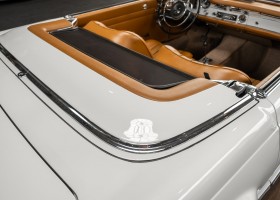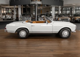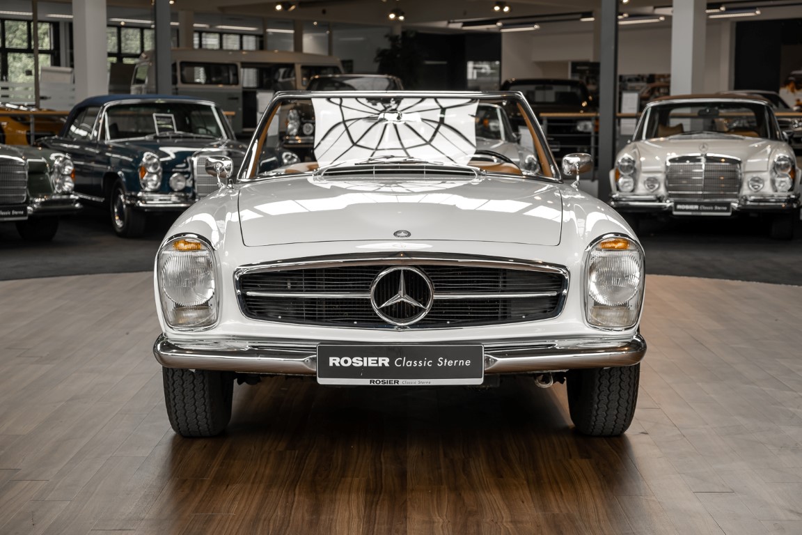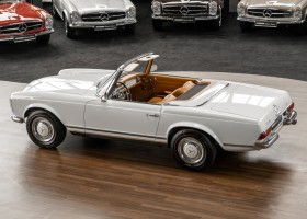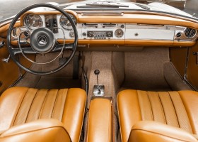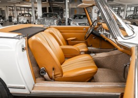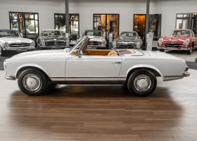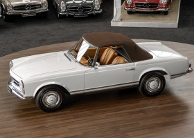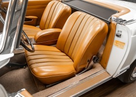 Eine wahrhaft einzigartige 230 SL Pagode können wir Ihnen mit diesem Traumroadster in klassischem Papyrusweiss mit braunem Kunstleder anbieten. Nicht mehr oft wird man eine solch originale und toperhaltene Pagode finden. Dem originalen Kundendienstheft ist zu entnehmen, dass das Fahrzeug am 17.11.1966 an seinen Besitzer in die französische Metropole Paris, genauer gesagt in die Gemeinde Ivry-sur-Seine – etwa 7km südöstlich des Pariser Stadtzentrums, geliefert wurde. Den lückenlosen Einträgen zufolge verblieb das Fahrzeug bis 1978 in Paris. Einträge aus Nizza und Monaco zeugen von ausgiebigen Reisen an die malerische Côte d’Azur, in dessen Umgebung sich dieser Klassiker wohl bestens eingefunden hat.