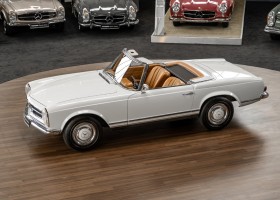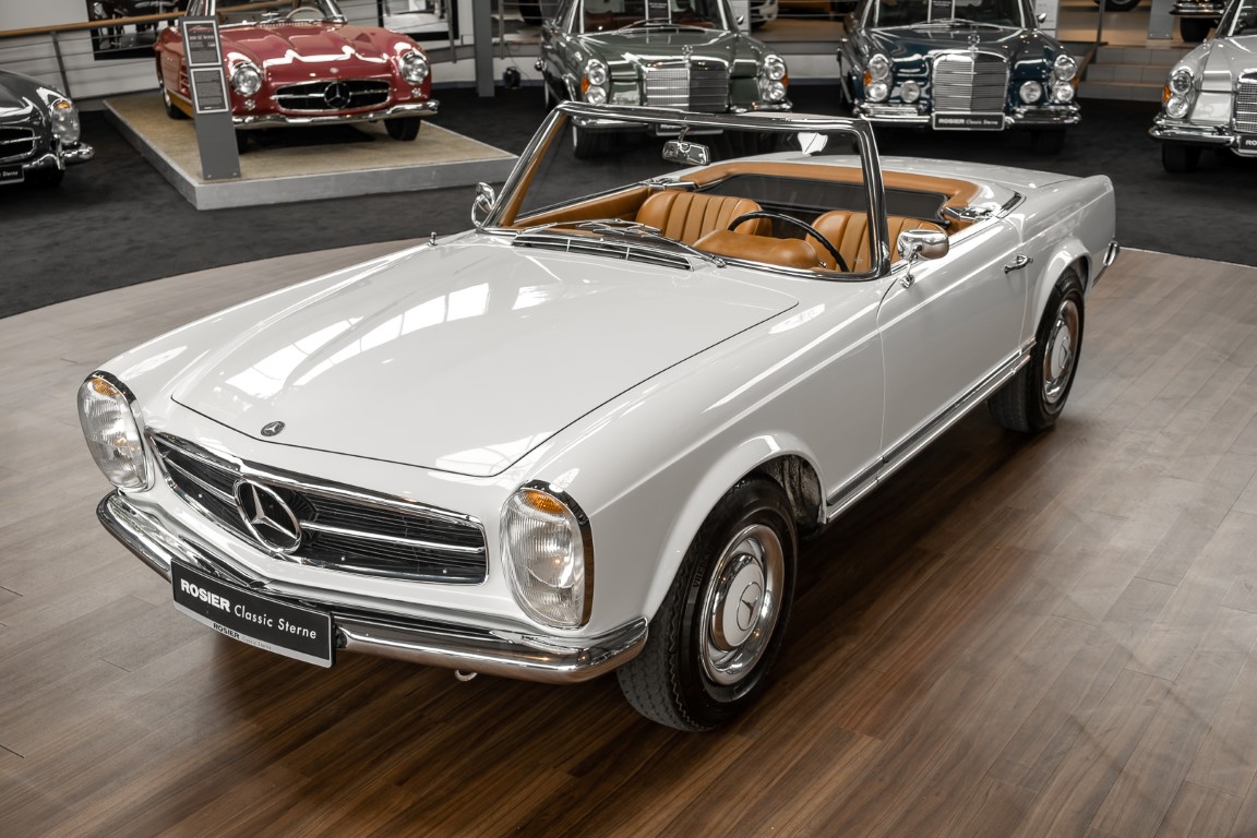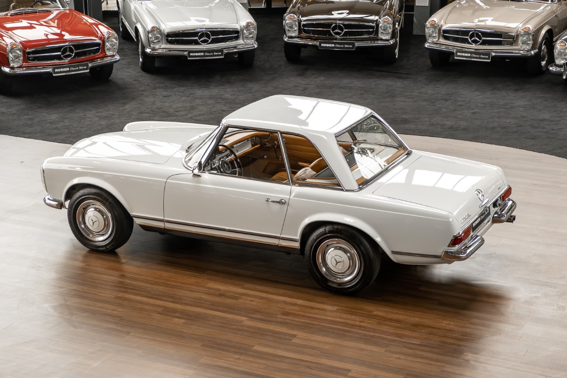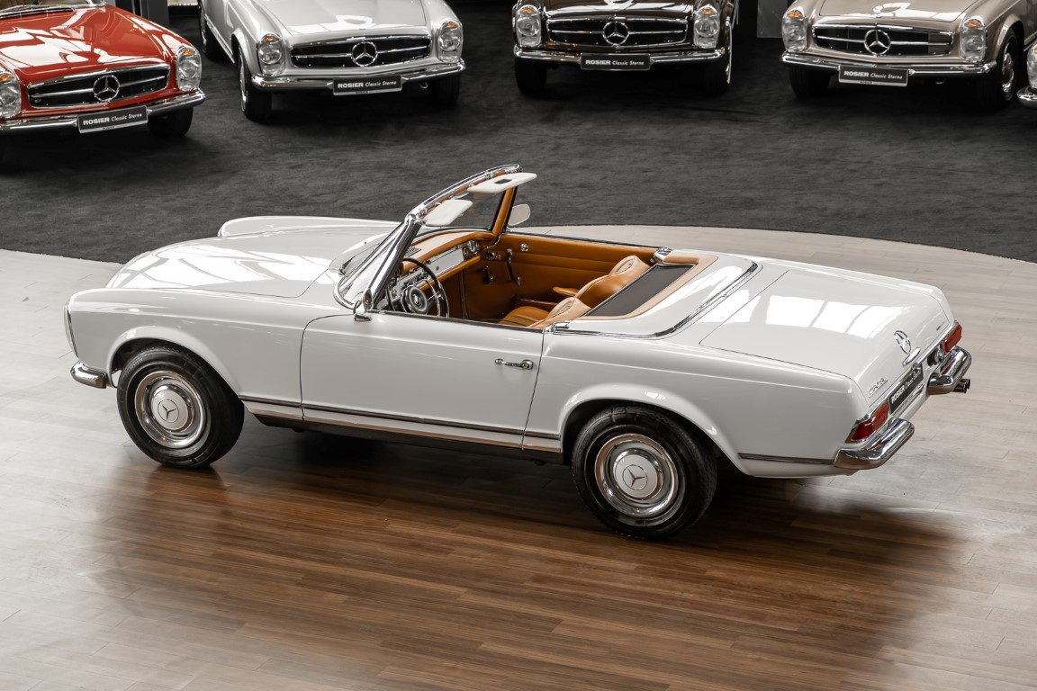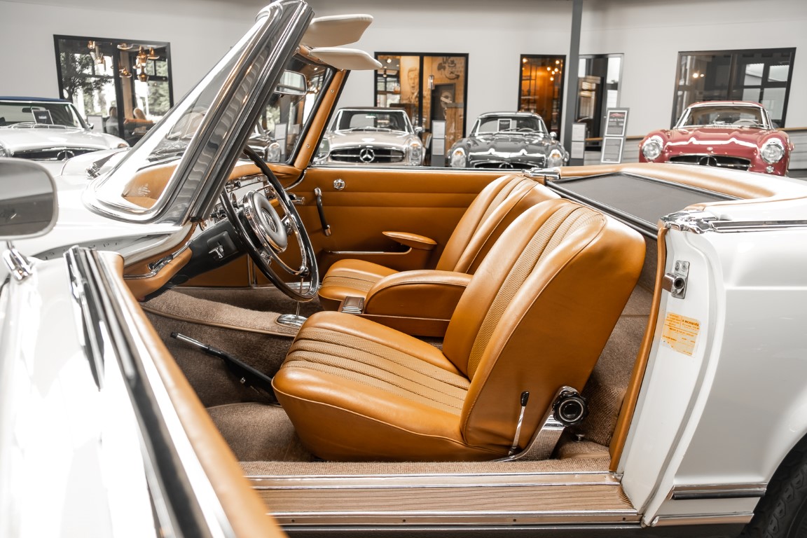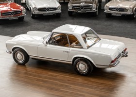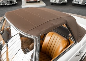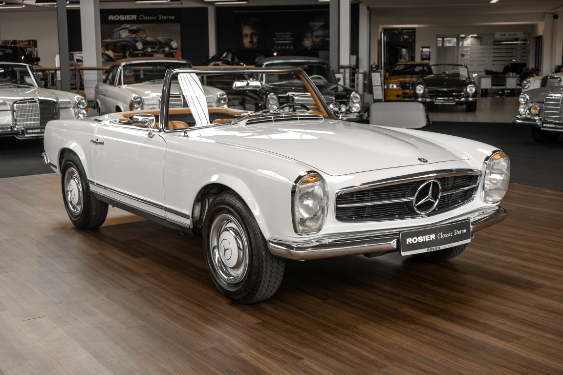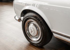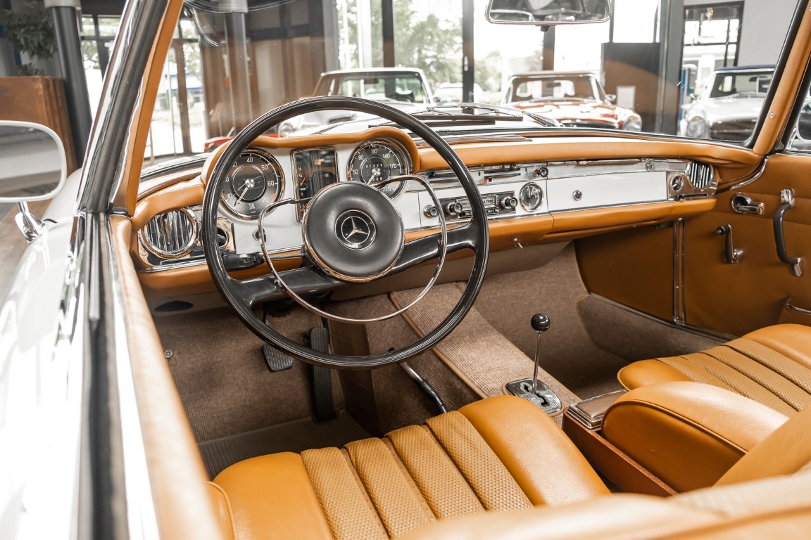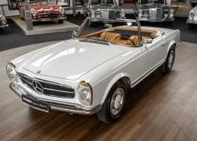 Eine wahrhaft einzigartige 230 SL Pagode können wir Ihnen mit diesem Traumroadster in klassischem Papyrusweiss mit braunem Kunstleder anbieten. Nicht mehr oft wird man eine solch originale und toperhaltene Pagode finden. Dem originalen Kundendienstheft ist zu entnehmen, dass das Fahrzeug am 17.11.1966 an seinen Besitzer in die französische Metropole Paris, genauer gesagt in die Gemeinde Ivry-sur-Seine – etwa 7km südöstlich des Pariser Stadtzentrums, geliefert wurde. Den lückenlosen Einträgen zufolge verblieb das Fahrzeug bis 1978 in Paris. Einträge aus Nizza und Monaco zeugen von ausgiebigen Reisen an die malerische Côte d’Azur, in dessen Umgebung sich dieser Klassiker wohl bestens eingefunden hat.