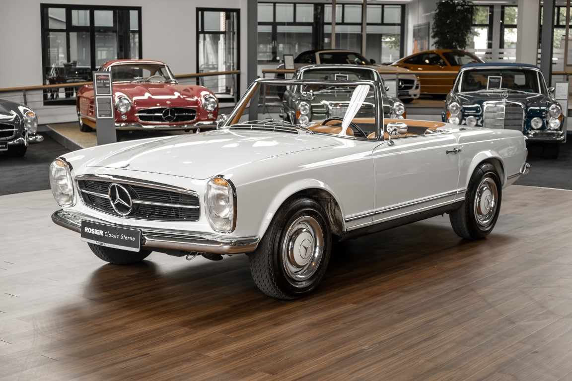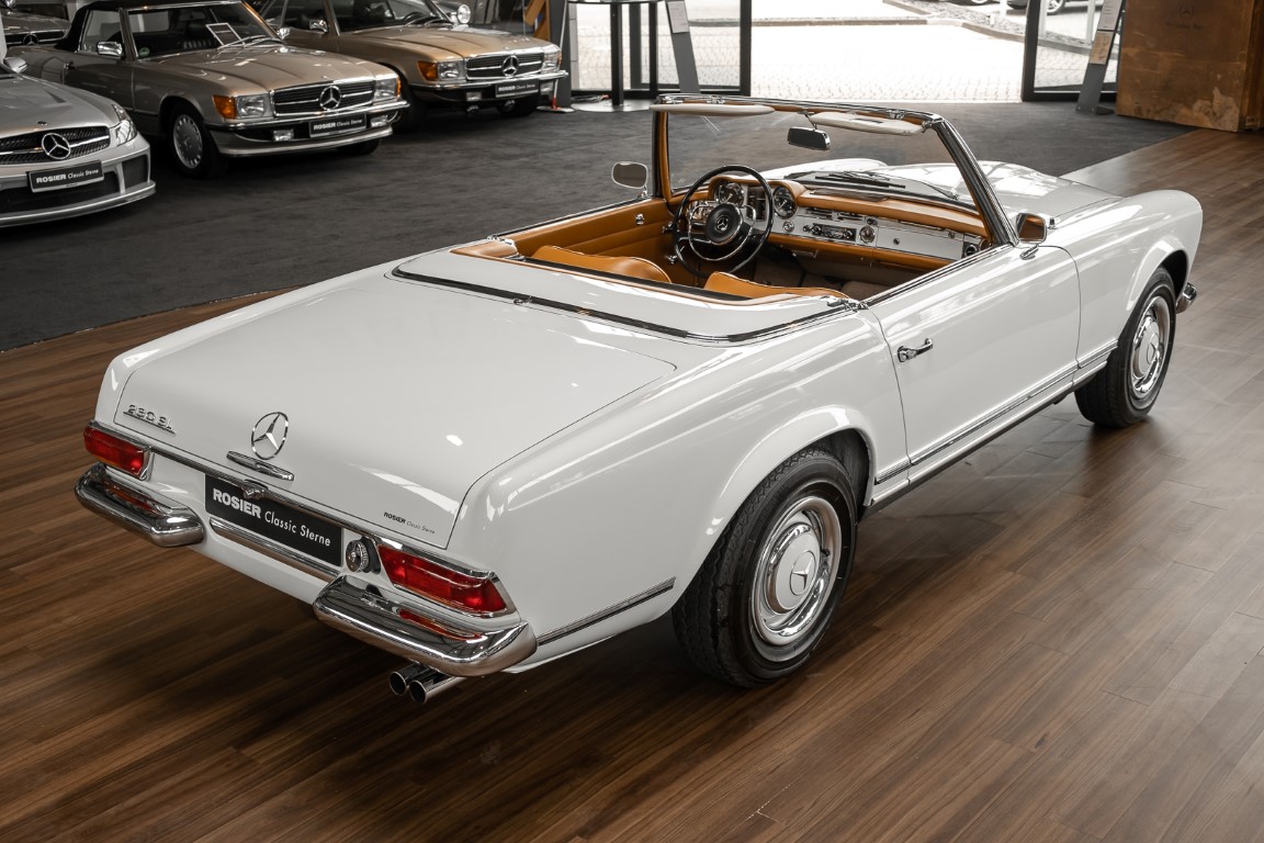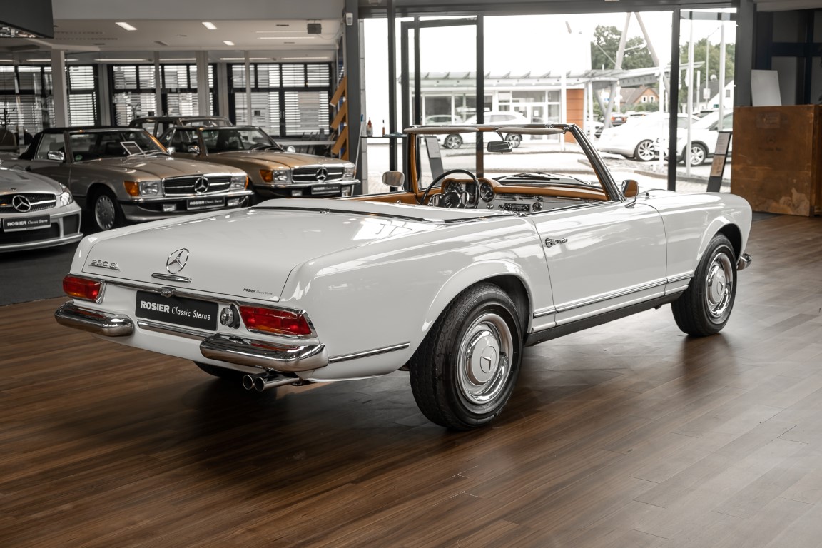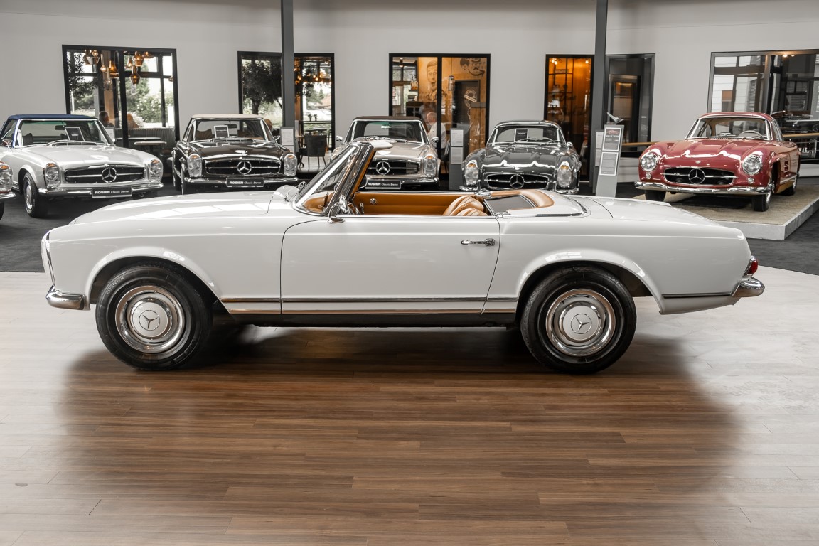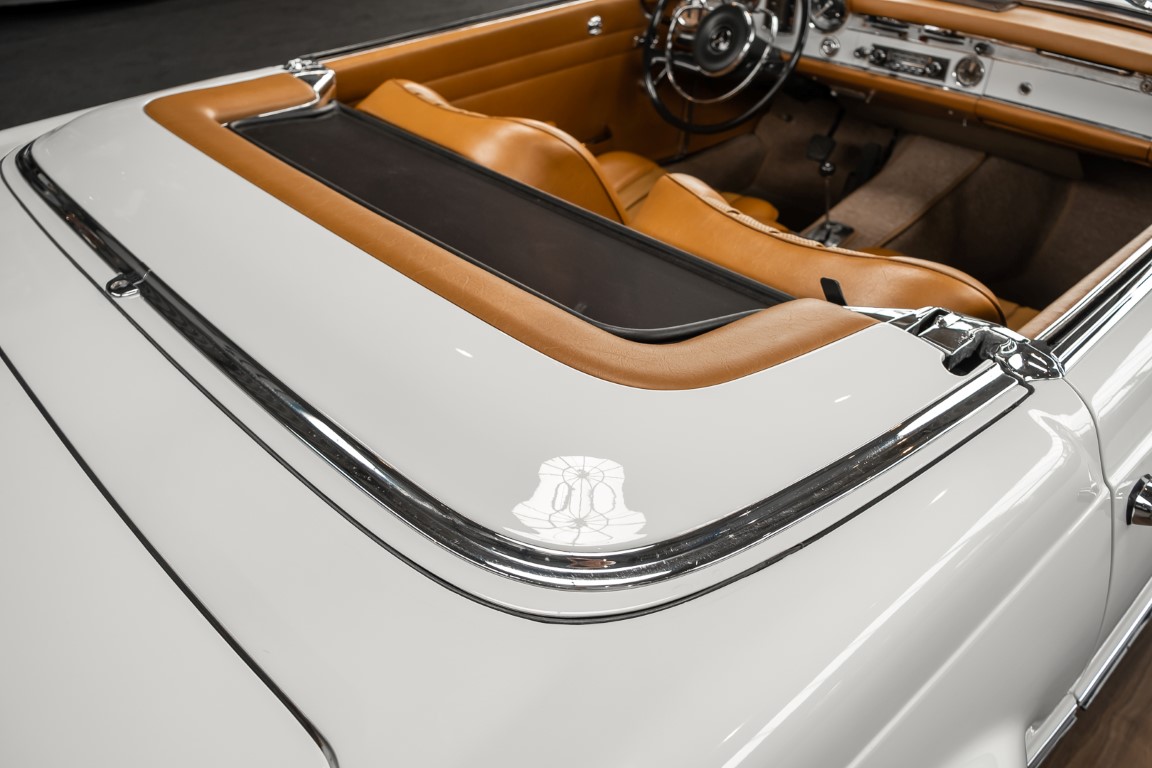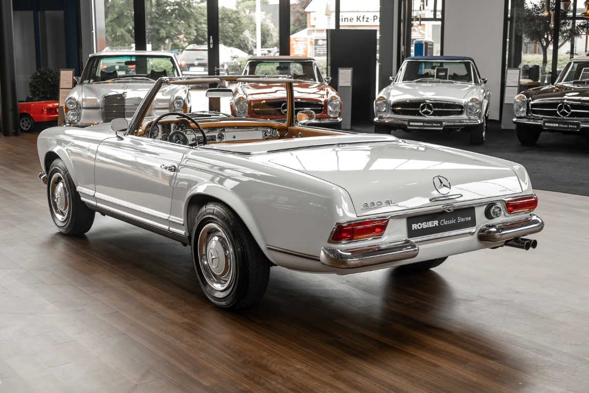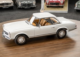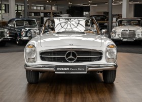 Eine wahrhaft einzigartige 230 SL Pagode können wir Ihnen mit diesem Traumroadster in klassischem Papyrusweiss mit braunem Kunstleder anbieten. Nicht mehr oft wird man eine solch originale und toperhaltene Pagode finden. Dem originalen Kundendienstheft ist zu entnehmen, dass das Fahrzeug am 17.11.1966 an seinen Besitzer in die französische Metropole Paris, genauer gesagt in die Gemeinde Ivry-sur-Seine – etwa 7km südöstlich des Pariser Stadtzentrums, geliefert wurde. Den lückenlosen Einträgen zufolge verblieb das Fahrzeug bis 1978 in Paris. Einträge aus Nizza und Monaco zeugen von ausgiebigen Reisen an die malerische Côte d’Azur, in dessen Umgebung sich dieser Klassiker wohl bestens eingefunden hat.