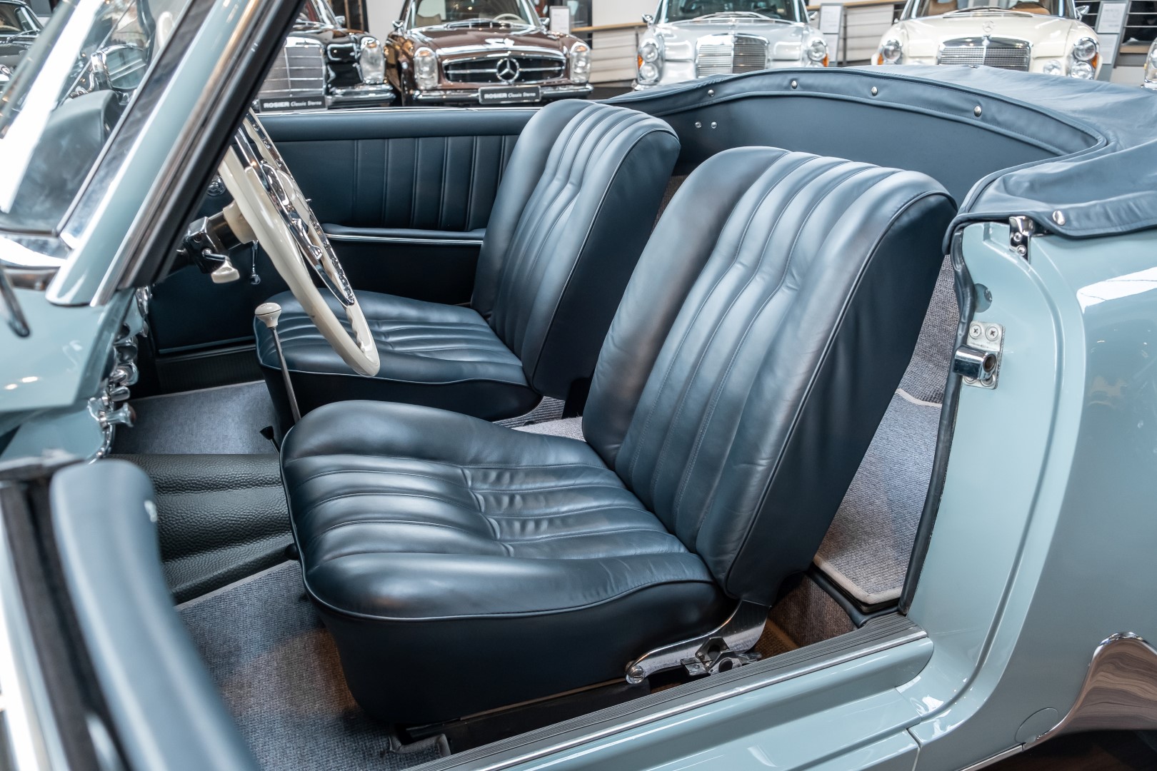 Dieser traumhafte 190 SL der Baureihe W121 wurde im Jahre 1962 fertiggestellt und gelang anschließend ins sonnige Kalifornien. Über 40 Jahre verblieb das Fahrzeug im Sonnenstaat bis das Fahrzeug im Jahre 1997 zurück nach Deutschland gelang. Durch das trockenwarme Klima war die Basis für die Restauration ideal. Bei einem renommierten Fachbetrieb wurde die Restauration von Grund auf und mit einem besonderen Maß an Qualität durchgeführt. Das Ergebnis beeindruckt: ein tadelloser Motorlauf, beste Fahreigenschaften und ein traumhaftes optisches Erscheinungsbild – vom Lackkleid über die Lederausstattung bis hin zum Stoffverdeck. Ein Mercedes-Enthusiast fand Gefallen an dem klassischen Roadster und verliebte sich spontan in die seltene Farbkombination Horizontblau mit dunkelblauem Leder und Verdeck-Stoff. Platzmangel ist der Grund dafür, dass wir Ihnen dieses Fahrzeug aus dessen erlesener Sammlung nun anbieten dürfen. Erleben Sie diesen Ausnahme 190er. Die nächsten Sonnentage kommen bestimmt.
