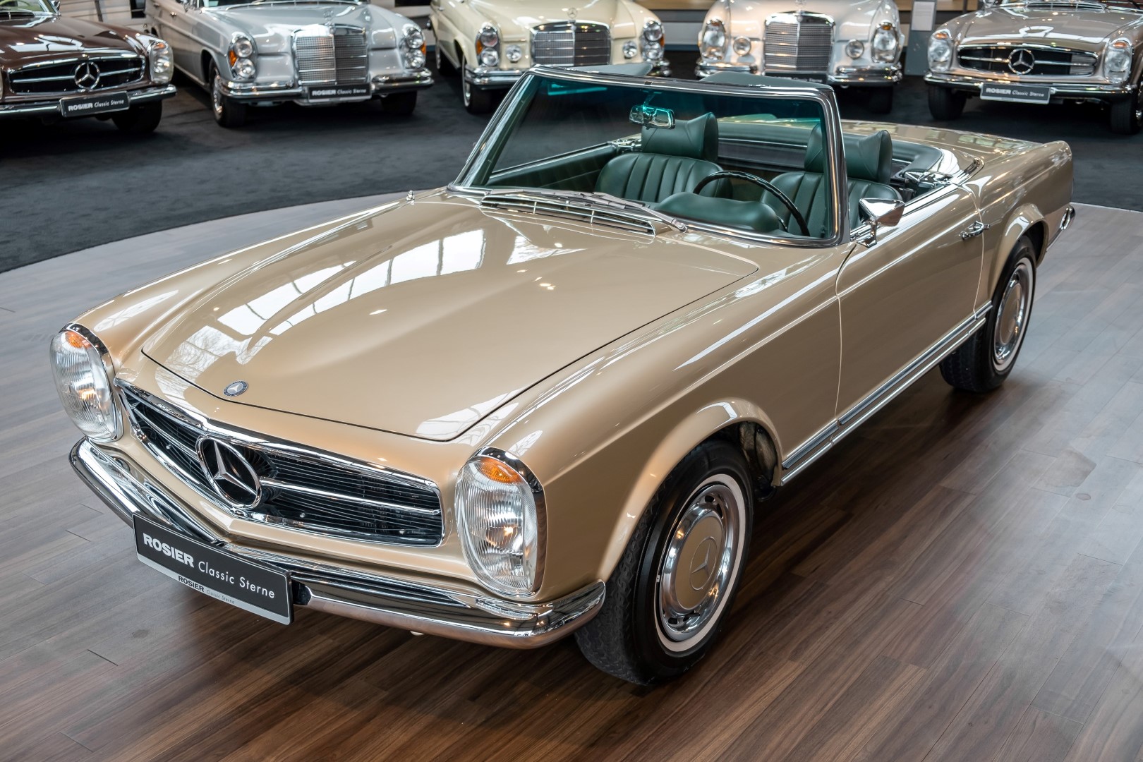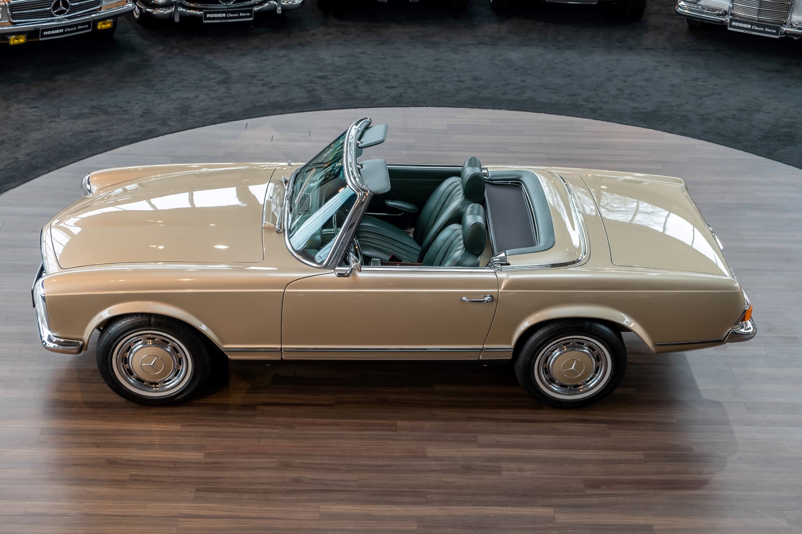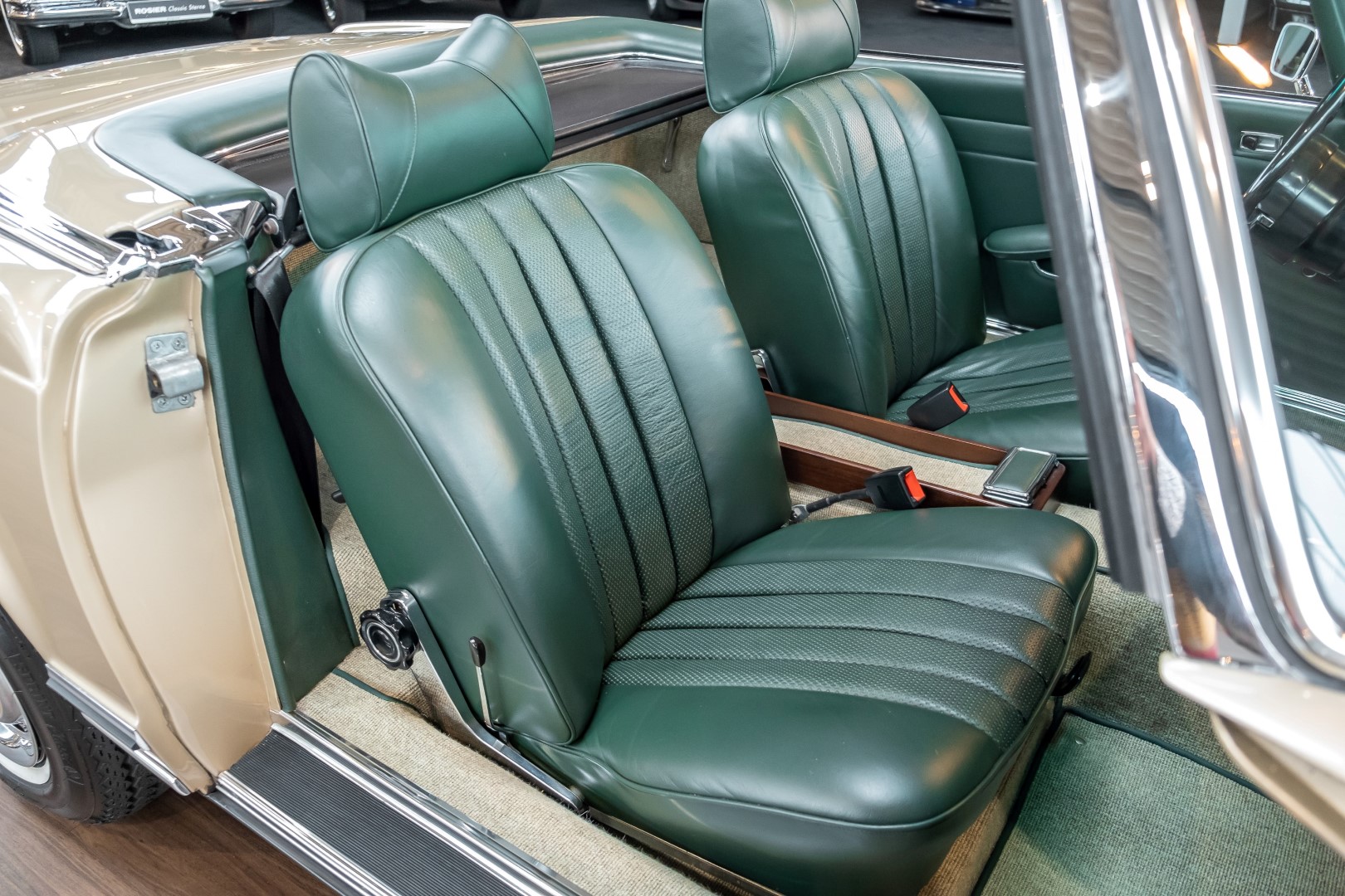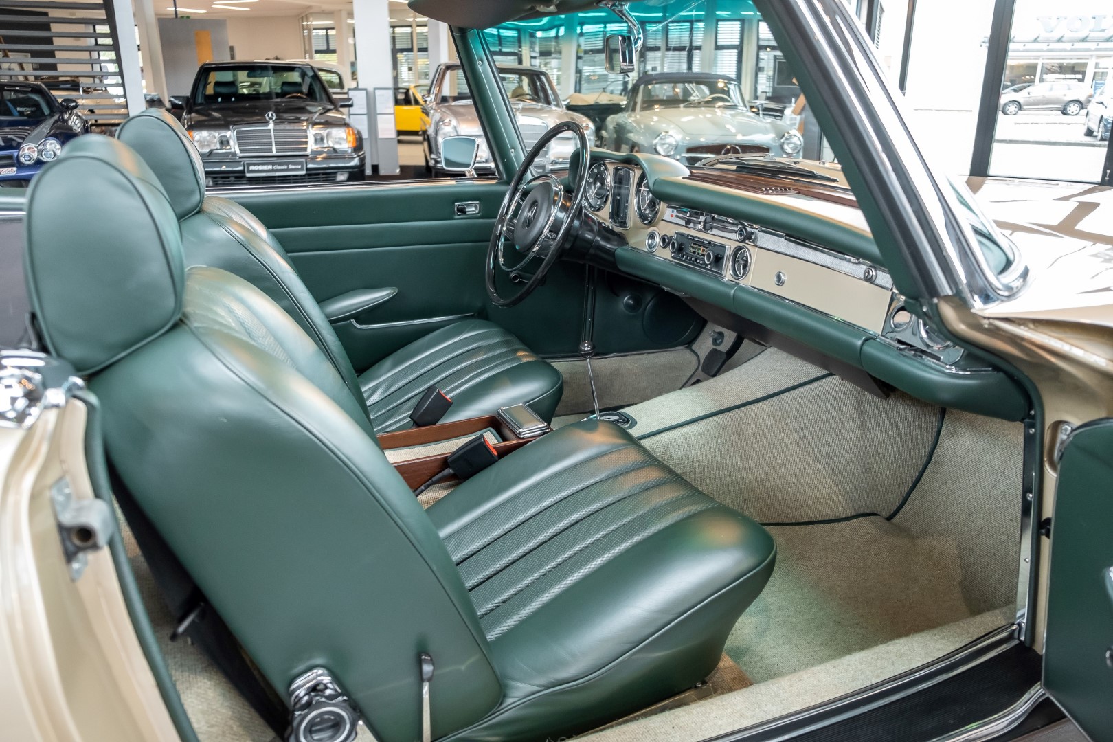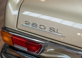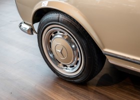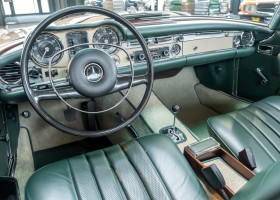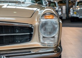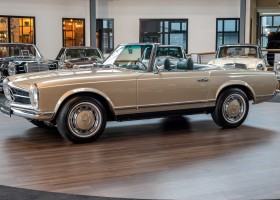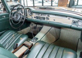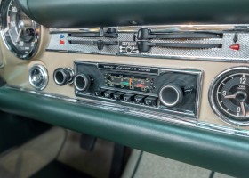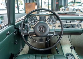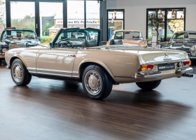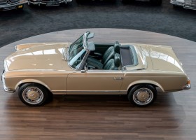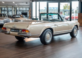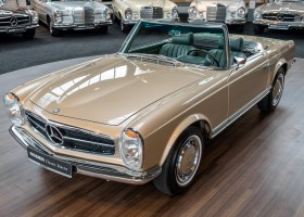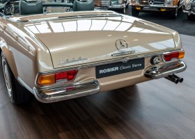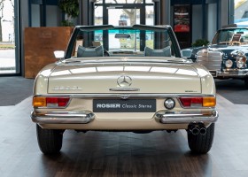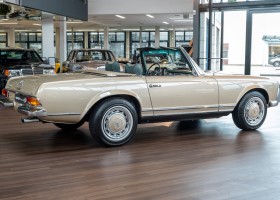 Im Jahre 1971 wurde diese Pagode in die sonnenverwöhnte Stadt Santa Anna in Südkalifornien ausgeliefert und ging direkt an die Firma Jim Slemons Imports, die schnell einen Käufer für das gefragte deutsche Cabrio gefunden haben durfte. Nach 41 Jahren im Jahr 2012 kam die Pagode nach Europa. Die unfallfreie und ungeschweißte Pagode wurde anschließend durch einen deutschen Fachbetrieb einer umfangreichen und qualitativ hochwertigen Restauration unterzogen. Alle Baugruppen wurden dabei zerlegt und geprüft, restauriert und bei Bedarf erneuert. Nach einjähriger Arbeit präsentiert sich dieser 280 SL in einem wahrlich exzellenten Zustand. Sowohl technisch als auch optisch überzeugt diese Pagode in allen Belangen. Ein Sammler und guter Kunde unseres Hauses fand damals auf Anhieb Gefallen an der Pagode in Tunisbeige Metallic (matching) in Kombination mit dunkelgrünem Leder. Nach fünf Jahren der Freude gibt der damalige Käufer nun aus Zeitgründen diese Traum-Pagode nun wieder dem Markt frei. Sicherlich wird dieses Exemplar für Aufsehen sorgen und schnell wieder einen Liebhaber finden, der die Qualität dieses Kult-Roadsters zu schätzen weiß. Herzlich willkommen bei ROSIER Classic Sterne.