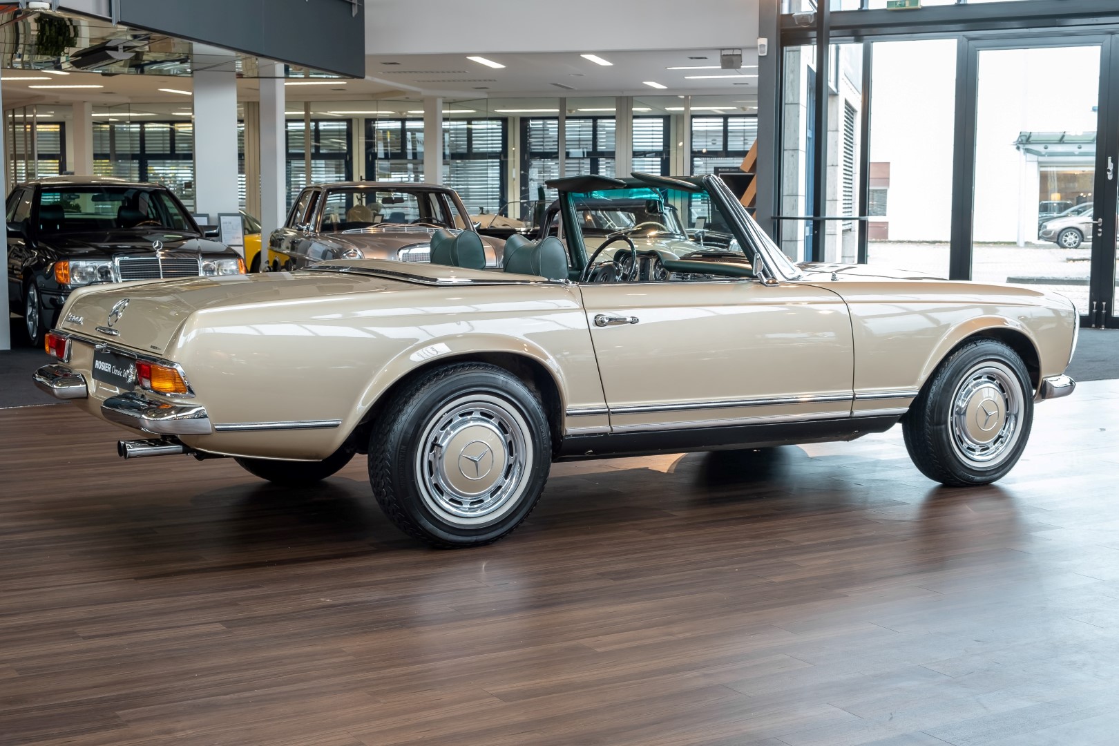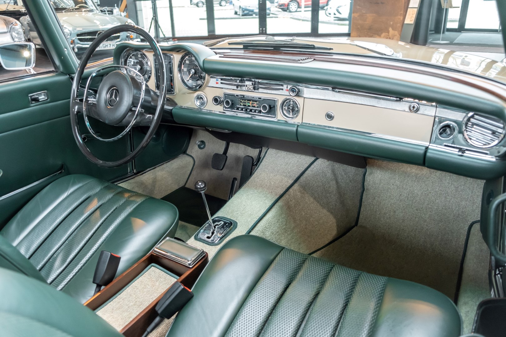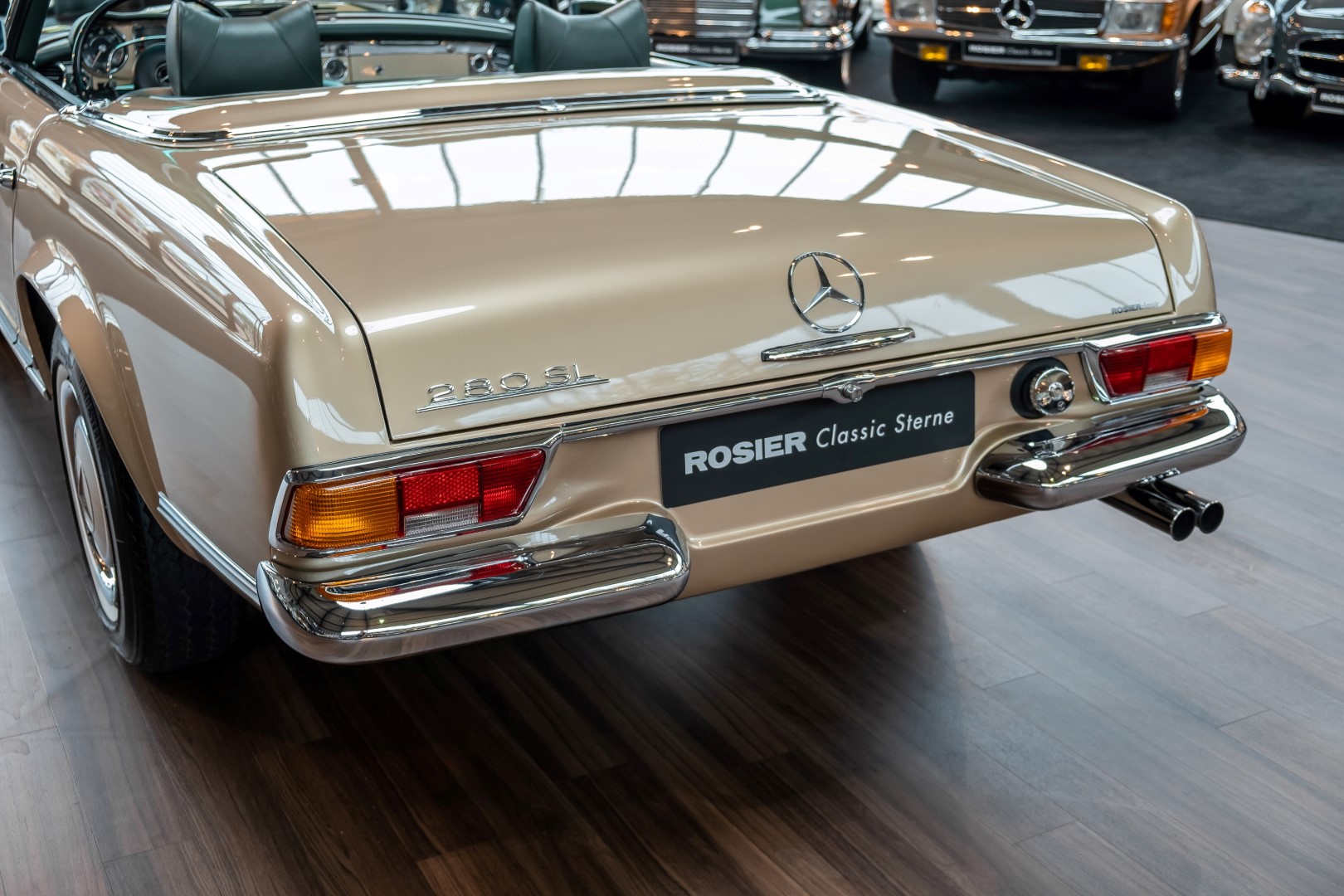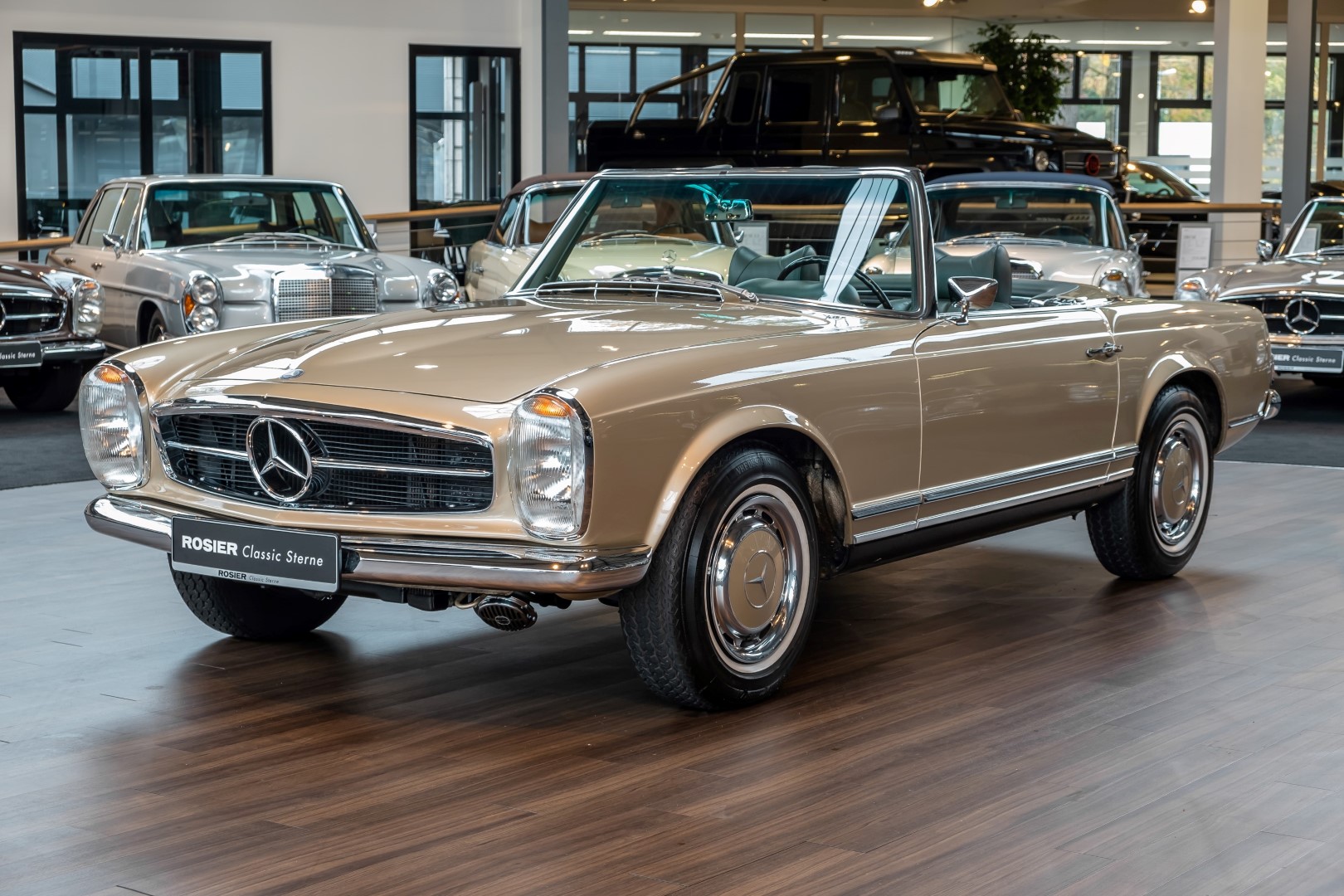 Im Jahre 1971 wurde diese Pagode in die sonnenverwöhnte Stadt Santa Anna in Südkalifornien ausgeliefert und ging direkt an die Firma Jim Slemons Imports, die schnell einen Käufer für das gefragte deutsche Cabrio gefunden haben durfte. Nach 41 Jahren im Jahr 2012 kam die Pagode nach Europa. Die unfallfreie und ungeschweißte Pagode wurde anschließend durch einen deutschen Fachbetrieb einer umfangreichen und qualitativ hochwertigen Restauration unterzogen. Alle Baugruppen wurden dabei zerlegt und geprüft, restauriert und bei Bedarf erneuert. Nach einjähriger Arbeit präsentiert sich dieser 280 SL in einem wahrlich exzellenten Zustand. Sowohl technisch als auch optisch überzeugt diese Pagode in allen Belangen. Ein Sammler und guter Kunde unseres Hauses fand damals auf Anhieb Gefallen an der Pagode in Tunisbeige Metallic (matching) in Kombination mit dunkelgrünem Leder. Nach fünf Jahren der Freude gibt der damalige Käufer nun aus Zeitgründen diese Traum-Pagode nun wieder dem Markt frei. Sicherlich wird dieses Exemplar für Aufsehen sorgen und schnell wieder einen Liebhaber finden, der die Qualität dieses Kult-Roadsters zu schätzen weiß. Herzlich willkommen bei ROSIER Classic Sterne.