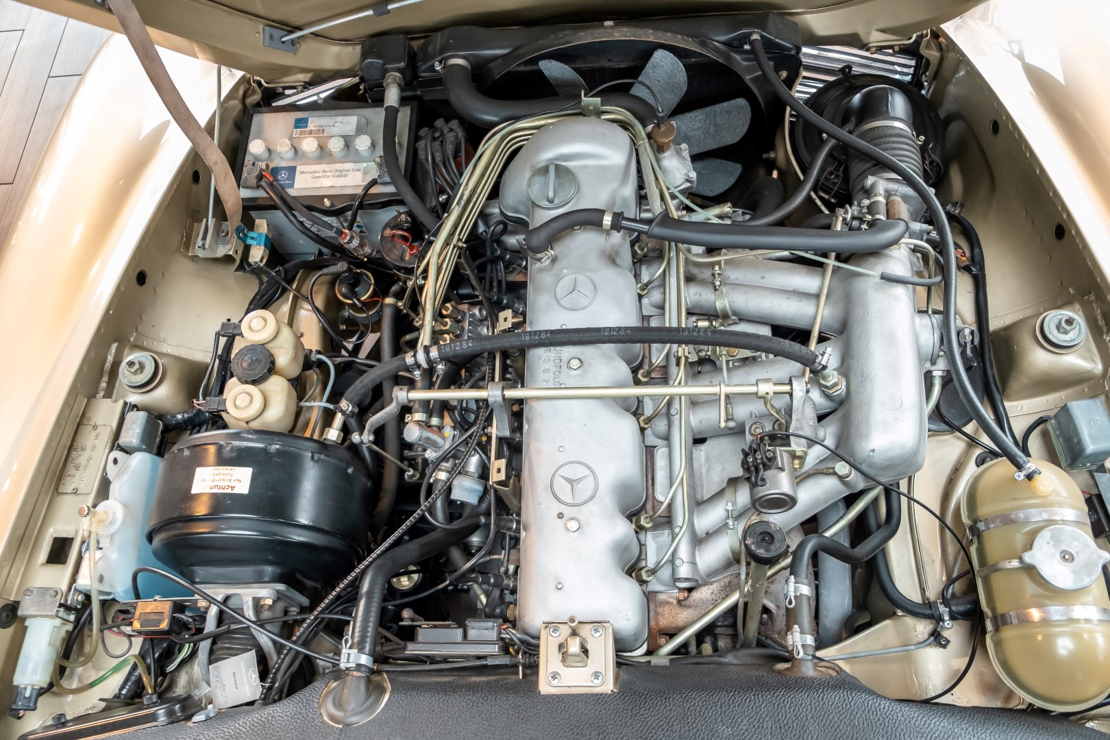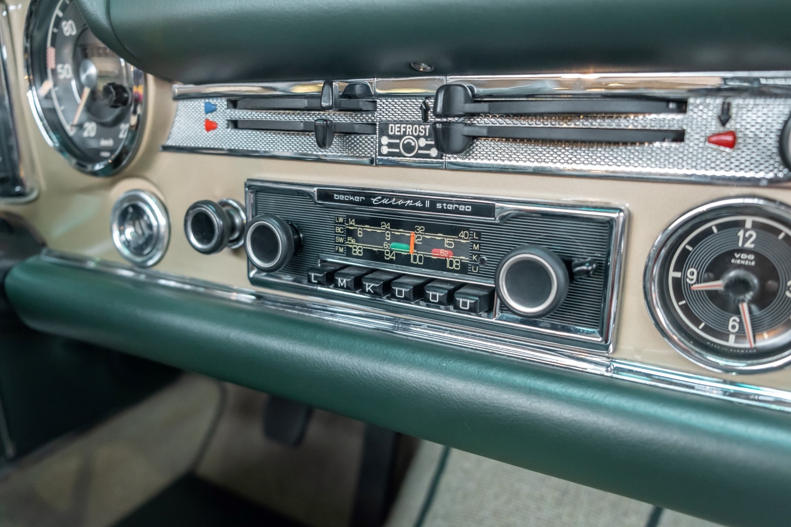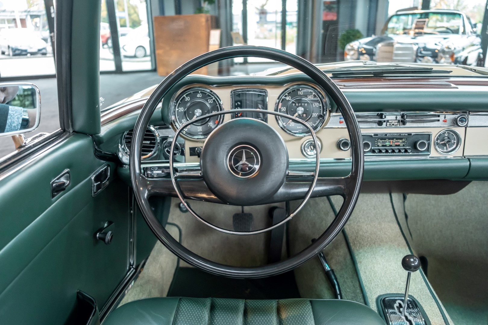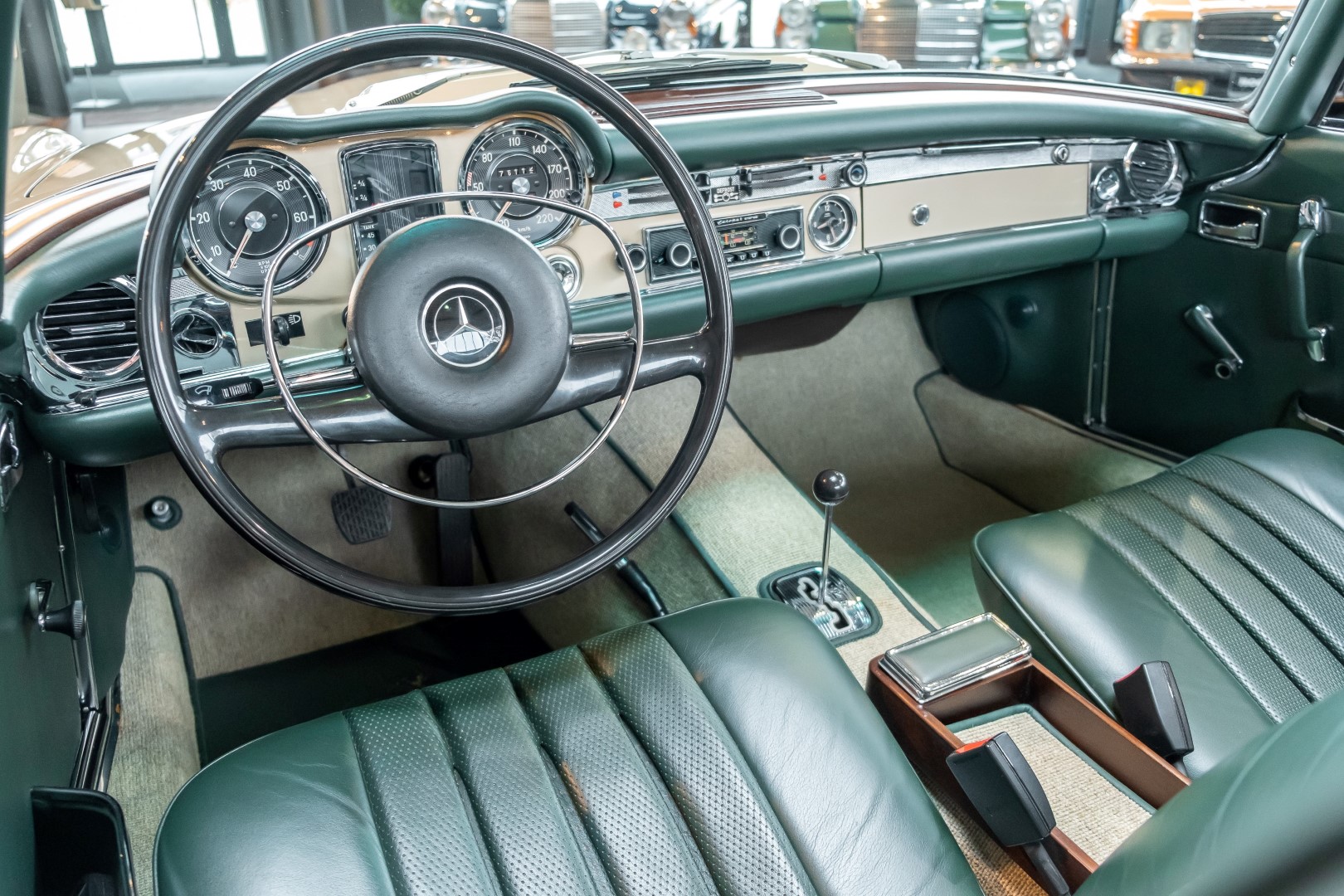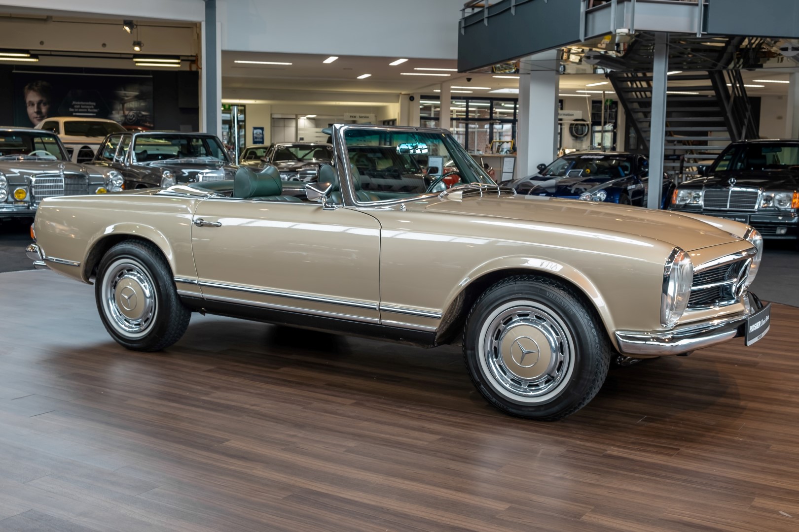 Im Jahre 1971 wurde diese Pagode in die sonnenverwöhnte Stadt Santa Anna in Südkalifornien ausgeliefert und ging direkt an die Firma Jim Slemons Imports, die schnell einen Käufer für das gefragte deutsche Cabrio gefunden haben durfte. Nach 41 Jahren im Jahr 2012 kam die Pagode nach Europa. Die unfallfreie und ungeschweißte Pagode wurde anschließend durch einen deutschen Fachbetrieb einer umfangreichen und qualitativ hochwertigen Restauration unterzogen. Alle Baugruppen wurden dabei zerlegt und geprüft, restauriert und bei Bedarf erneuert. Nach einjähriger Arbeit präsentiert sich dieser 280 SL in einem wahrlich exzellenten Zustand. Sowohl technisch als auch optisch überzeugt diese Pagode in allen Belangen. Ein Sammler und guter Kunde unseres Hauses fand damals auf Anhieb Gefallen an der Pagode in Tunisbeige Metallic (matching) in Kombination mit dunkelgrünem Leder. Nach fünf Jahren der Freude gibt der damalige Käufer nun aus Zeitgründen diese Traum-Pagode nun wieder dem Markt frei. Sicherlich wird dieses Exemplar für Aufsehen sorgen und schnell wieder einen Liebhaber finden, der die Qualität dieses Kult-Roadsters zu schätzen weiß. Herzlich willkommen bei ROSIER Classic Sterne.