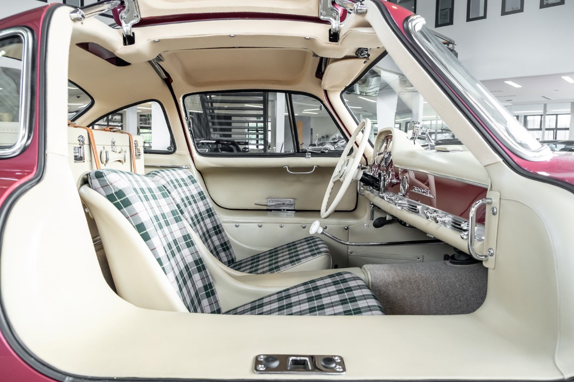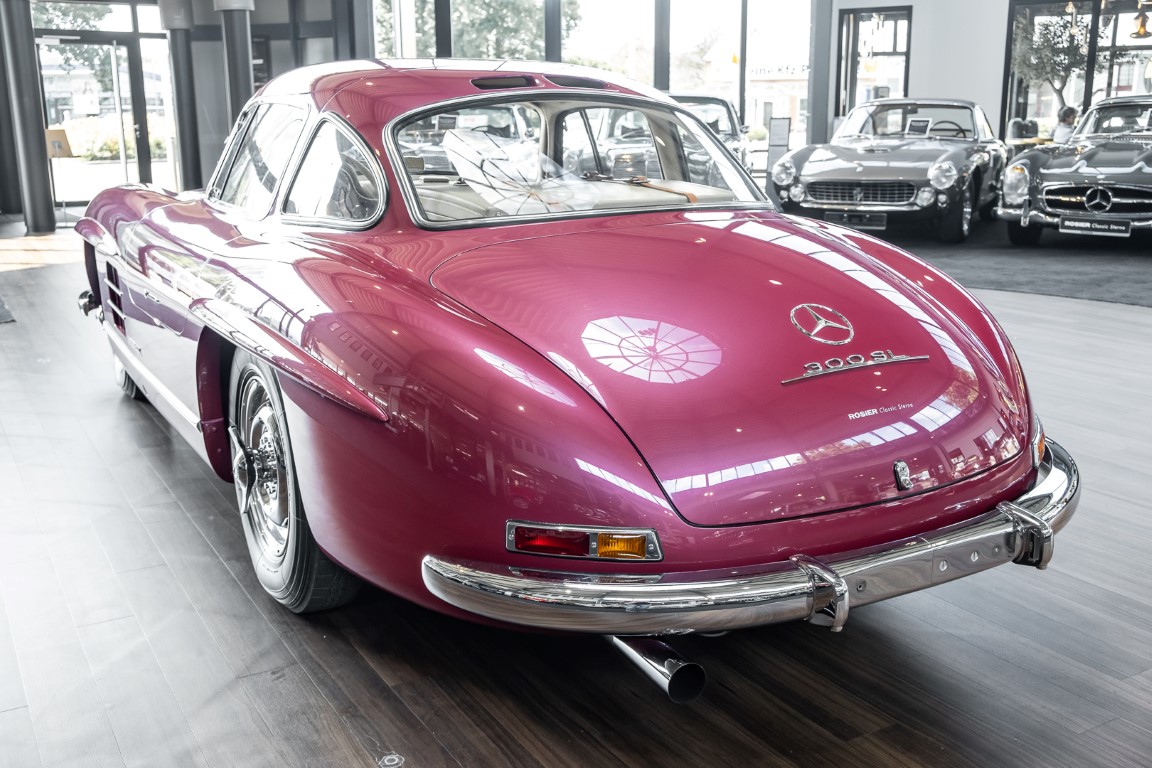 Laut dem Gullwing Group Registry war der erste Besitzer des Coupés Nr. 20 Roy Miller aus China Lake, USA. In den frühen 1970er Jahren wurde Weston Hook aus La Jolla, Kalifornien, Eigentümer, der den Wagen in den nächsten vier Jahrzehnten betreute und schließlich an seinen Sohn übergab. Weston Hook verbrachte seine Zeit sowohl in Kalifornien als auch auf Hawaii, wobei letzteres das Zentrum seiner Immobiliengeschäfte war, und so pendelte der Wagen zwischen den beiden sonnigen Orten am Pazifik. Nach mehreren Jahrzehnten des Besitzes und der Nutzung beauftragte Hook den wohl renommiertesten 300 SL-Restaurator Jerry Hjeltness aus Escondido, Kalifornien, mit einer Restaurierung, deren Ergebnis man kurz und knapp als außergewöhnlich bezeichnen kann. Im Laufe von zwei Jahren und mit viel Liebe zum Detail wurde der Flügel mit der Nr. 20 bis ins kleinste Detail komplett restauriert und in den zeitgemäßen Mercedes- Farben DB 543 Erdbeerrot Metallic lackiert. Die Kombination mit beigefarbener Lederausstattung und grün karierten Sitzen ist stilsicher und außergewöhnlich. Passendes Gepäck und verchromte Rudge-Räder vervollständigen das unbestreitbar schöne Erscheinungsbild, das in jeder Gesellschaft die Aufmerksamkeit auf sich zieht. Das Ergebnis dieser Restaurierung hat unweigerlich zu vielen Concours-Siegen in der Klasse und in ganzen Ausstellungsbereichen geführt. Das Auto ist einfach eine „Best-of-the-Best“-Restaurierung, von einem der besten 300SL-Restauratoren.