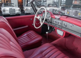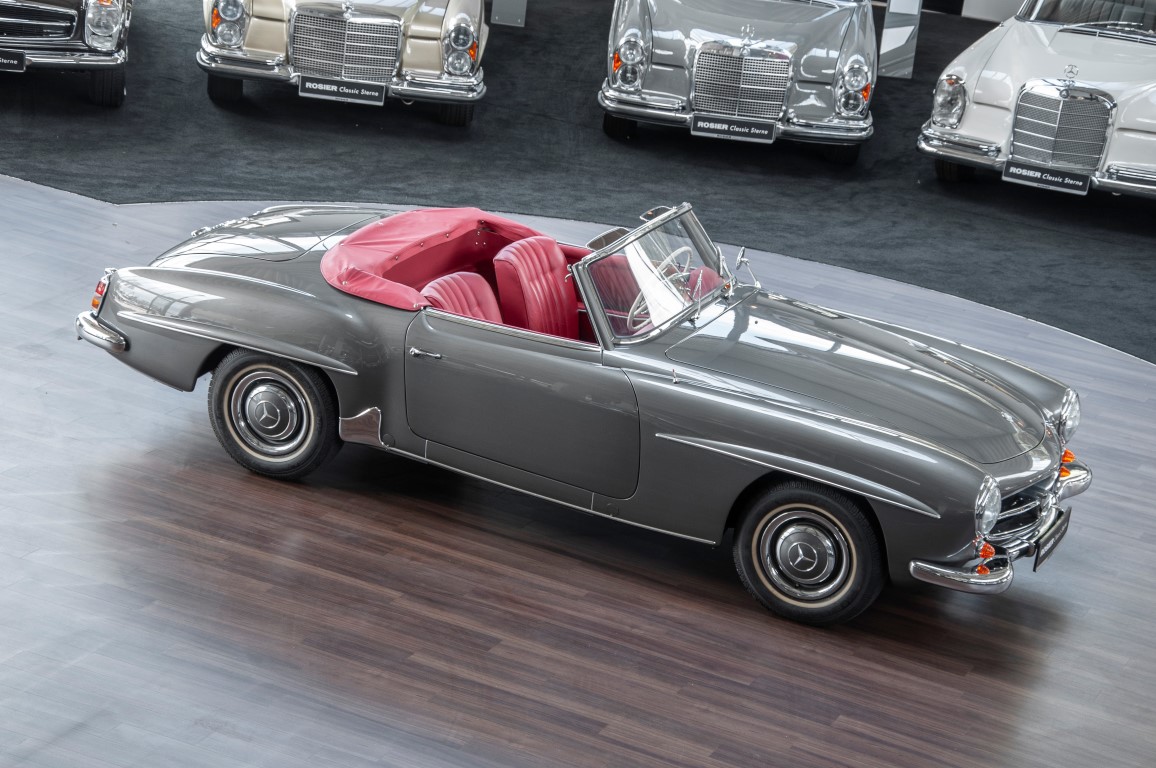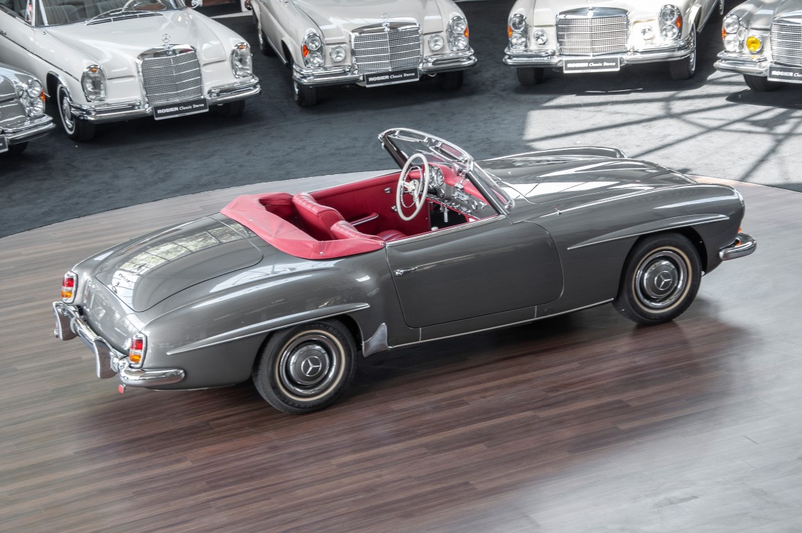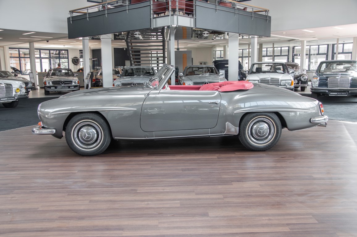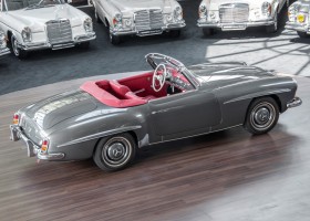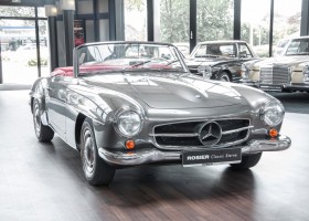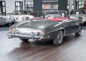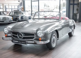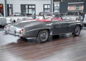 This highly elegant Mercedes-Benz 190SL Roadster was delivered in April 1959 to the general agent of Daimler-Benz, Joseph F. Weckerle, in Morocco, which had meanwhile become independent. He was a big fan of this elegant roadster series and liked to sell it to the wealthy upper class to which he maintained excellent contacts. He himself had already won the "Casablanca Grand Prix" in 1956 in a Mercedes-Benz 190SL touring sports car and had thus made a good name for himself. As a result, the roadster found its way to the USA. There it was very popular and was regarded as one of the most elegant vehicles of the 1950s and early 1960s. In 2011, the 190SL returned to its native country, Germany. A Mercedes specialist near the Swabian capital Stuttgart had acquired it. He subjected the 190SL Roadster to a detailed full restoration. The result of Swabian craftsmanship was fantastic. Everything presented itself as new. The colour scheme in the original Mercedes-Benz colour, DB 172 "anthracite grey metallic" in combination with dark red leather, made the 190SL look like its big brother the 300SL. A uniquely beautiful charisma. A prominent Swabian soon succumbed to the charm of this roadster and still owned the car today. Let yourself be captivated by the charm of this roadster, too, and soon start wonderful trips with the roof open and enjoy the friendly waving of many a participant in the traffic.