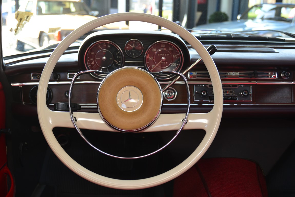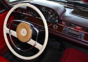 In October 2018, a Mercedes lover from Spain became aware of the car. He had discovered it in a dry barn, in a community of 75 souls in the province of Soria. The car was dusty, the barn well ventilated, the climate there dry. A black Mercedes-Benz 250SE with light red leather stood well protected there. On closer inspection, it turned out that the car had spent a long time in the best substance, without any rust. A few slight dents and minor scratches from over 50 years probably had to be put up with. When opening the doors, an absolutely new red leather appeared, which looked as if nobody had ever sat on it before. On the inside of the doors were still the protective foils from the factory. A look at the speedometer caused the breath to falter. Only 7,022 kilometers on the 5-digit display and no wear. Sensational ! The profile of the tires was as good as new, a control of the manufacturing date resulted in that it must be the first tires, from 1966.