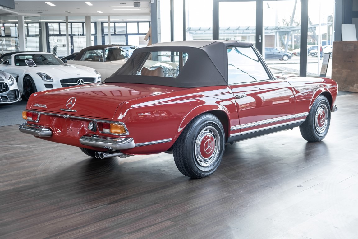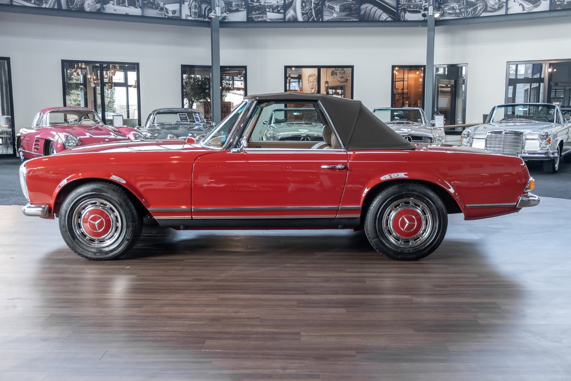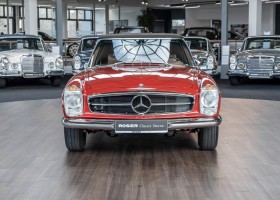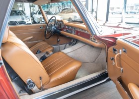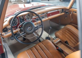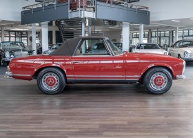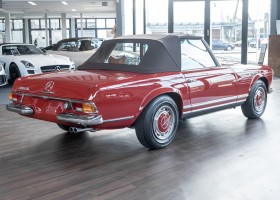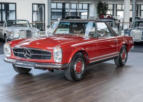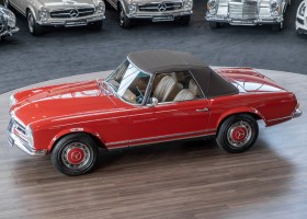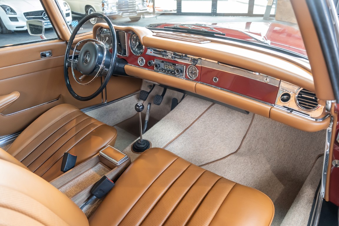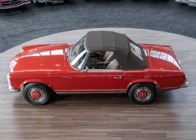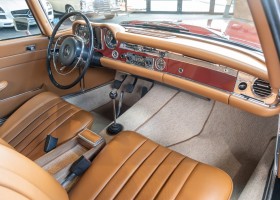 An interesting Pagoda with a comprehensible history, which would have been immediately ready for extended trips. Our plans for the vehicle, however, were different. Under our direction, the car underwent an extensive restoration. The task was to achieve a quality restoration at the highest level of craftsmanship. See for yourself, the goal was excellently achieved. The body has been extensively reworked and repainted, axles and transmission have been overhauled, the engine has been tested and fine-tuned after passing the pressure loss test. Powerful running and a clean compression pattern underline the result. To upgrade the interior and give the overall look the final touch, we decided to upgrade the interior with fine leather in cognac instead of the original MB-Tex. A soft top in dark brown makes this Pagoda a real eye-catcher. All in all a special Pagoda, which knows how to convince with its unique charm and inspires with manual transmission. Get in and experience this dream pagoda with all your senses.