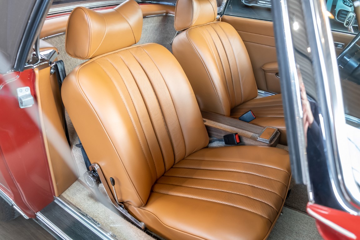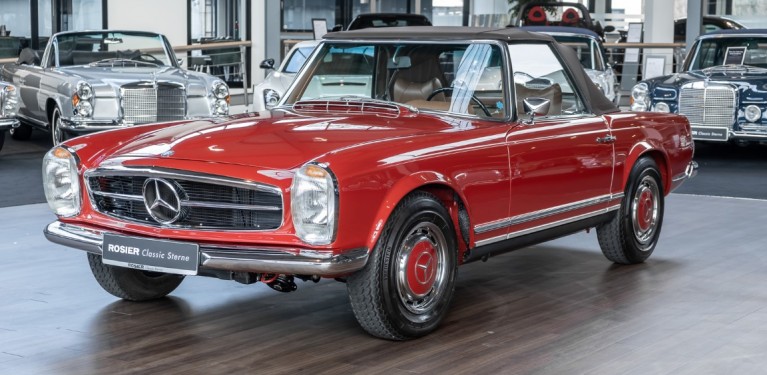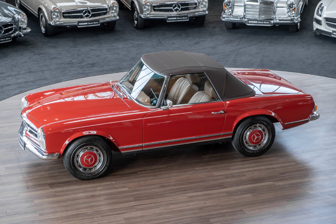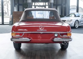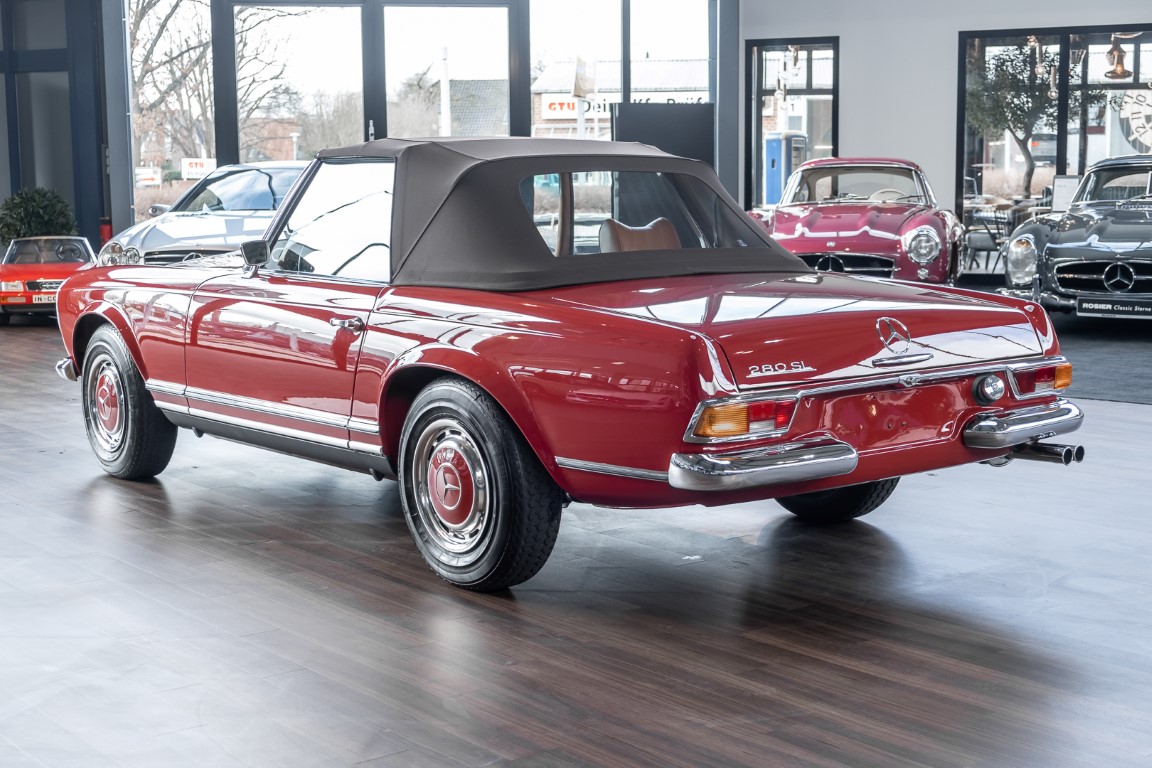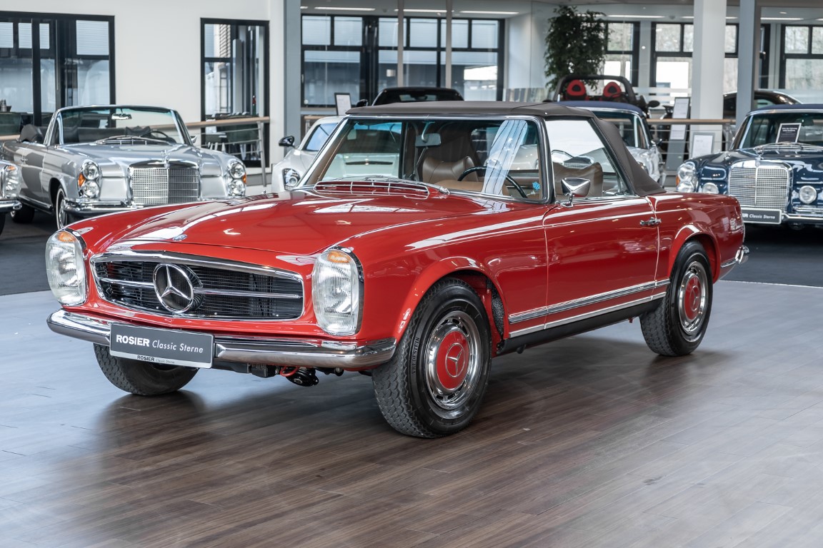 An interesting Pagoda with a comprehensible history, which would have been immediately ready for extended trips. Our plans for the vehicle, however, were different. Under our direction, the car underwent an extensive restoration. The task was to achieve a quality restoration at the highest level of craftsmanship. See for yourself, the goal was excellently achieved. The body has been extensively reworked and repainted, axles and transmission have been overhauled, the engine has been tested and fine-tuned after passing the pressure loss test. Powerful running and a clean compression pattern underline the result. To upgrade the interior and give the overall look the final touch, we decided to upgrade the interior with fine leather in cognac instead of the original MB-Tex. A soft top in dark brown makes this Pagoda a real eye-catcher. All in all a special Pagoda, which knows how to convince with its unique charm and inspires with manual transmission. Get in and experience this dream pagoda with all your senses.