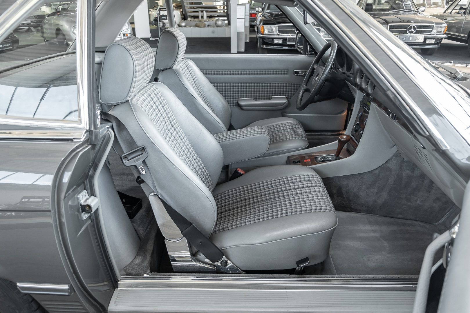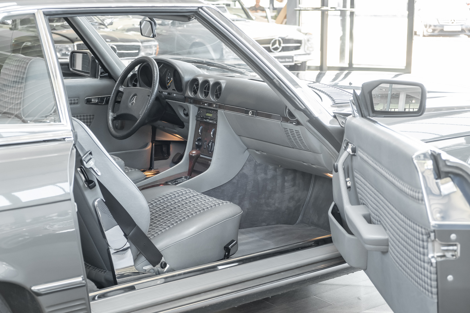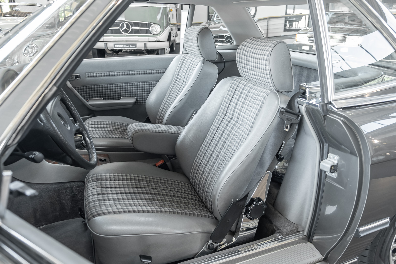 New in the showroom: 300 SL of the 107 model series in anthracite gray metallic in perfect combination with gray check fabric seats. With a mileage of only 41,000 km and a well-maintained Mercedes service booklet this 300 SL presents itself in top condition without exception. The vehicle is currently being reconditioned, further information will follow.